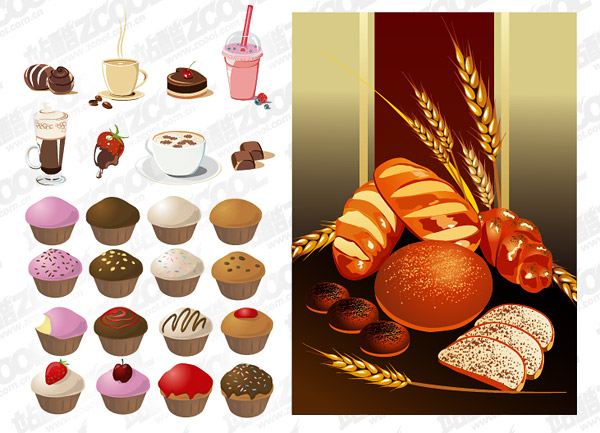 Cake, bread, drinks and other vector material